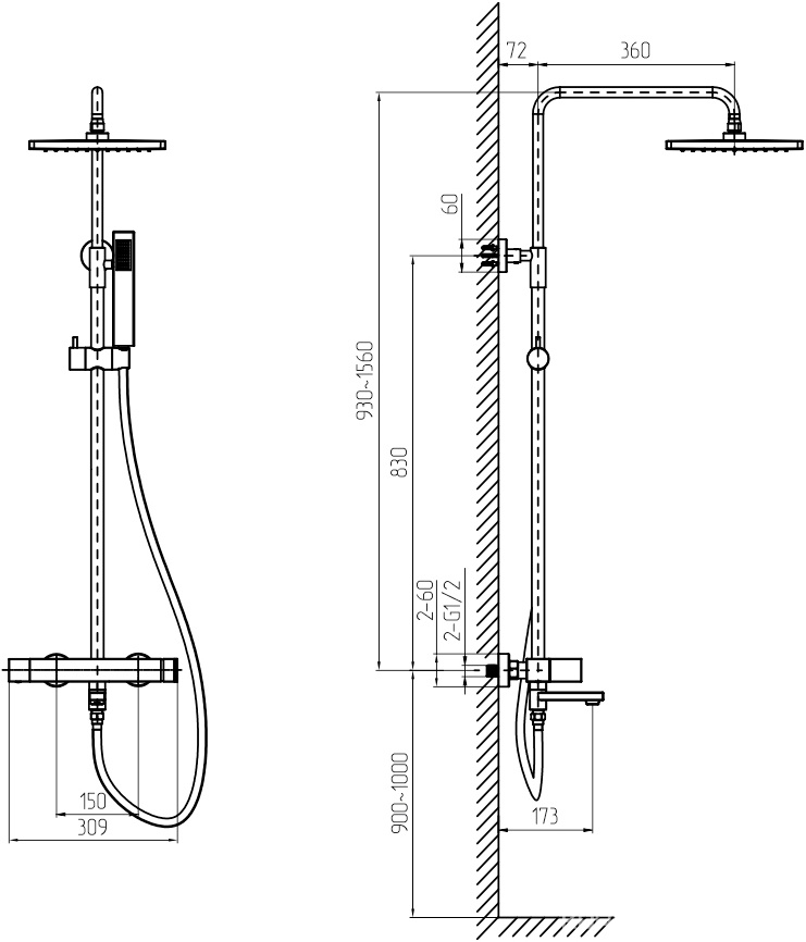 Душевая стойка для ванны/душа, с верхним и ручным душем, цв. черный матовый ZZПод заказ