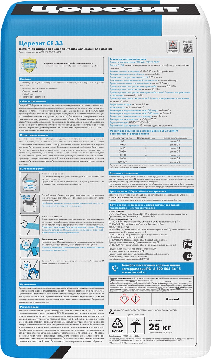 Ceresit CE33/25кг Затирка для швов 1-6 мм внутри и снаружи Белый 01, РФ ZZПод заказ