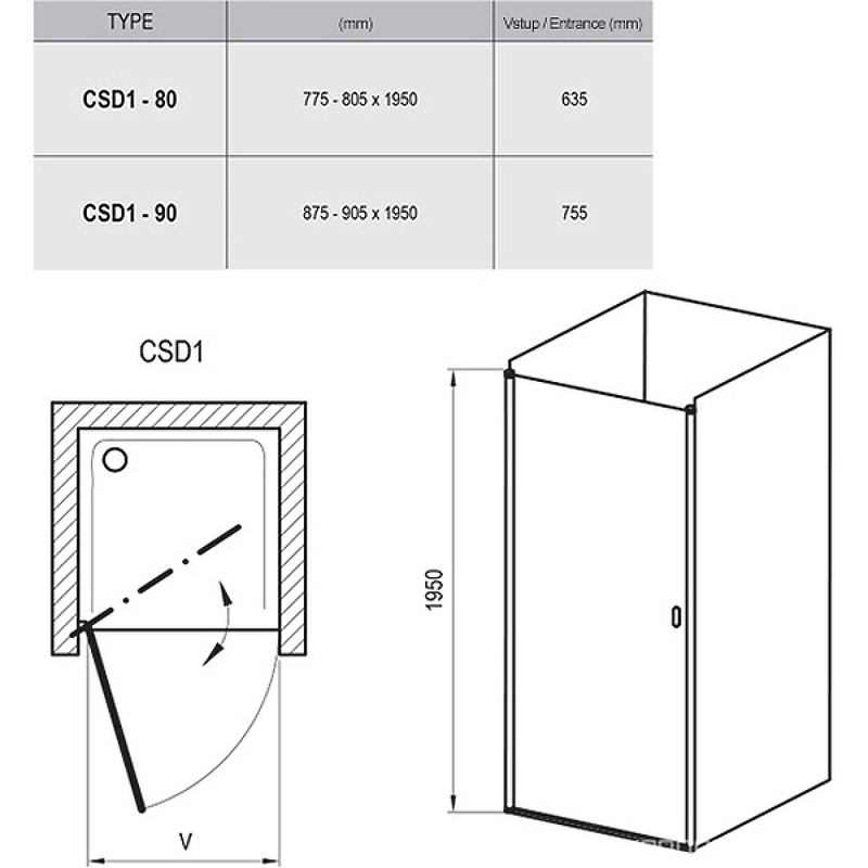Дверь душевая CSD1-80 80х195 см, стекло-Transparent,6 мм, профиль-хром ZZПод заказ