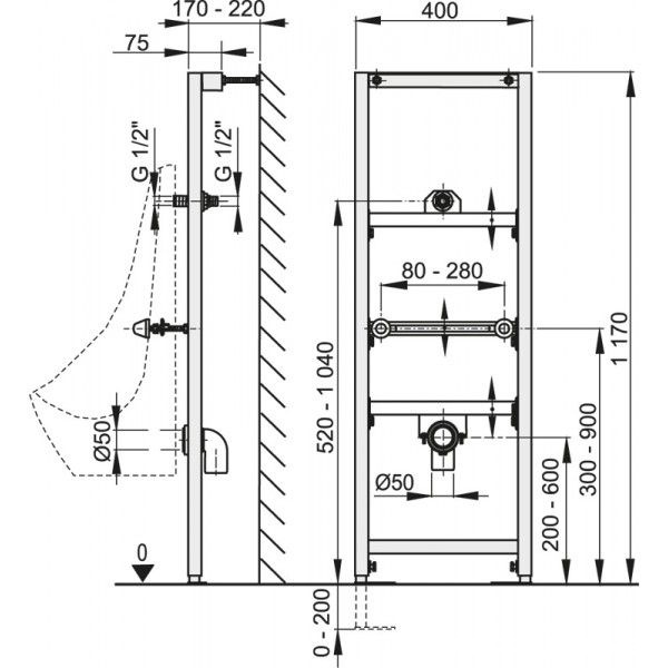 Инсталляция для писсуара с открытой системой крепежа, БЕЗ сифона и крана смыва (клавиша смыва не предусм.) ZZПод заказ
