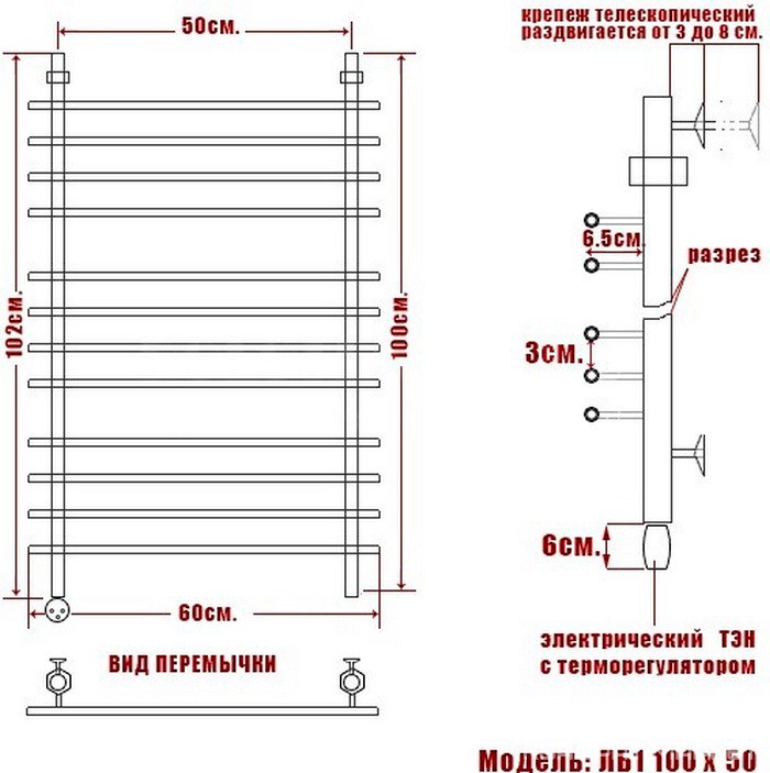 Полотенцесушитель "ЛБ-4" h800*100*500 мм, электрический, ТЭН справа "МЕG-1.0", цвет хром ZZПод заказ