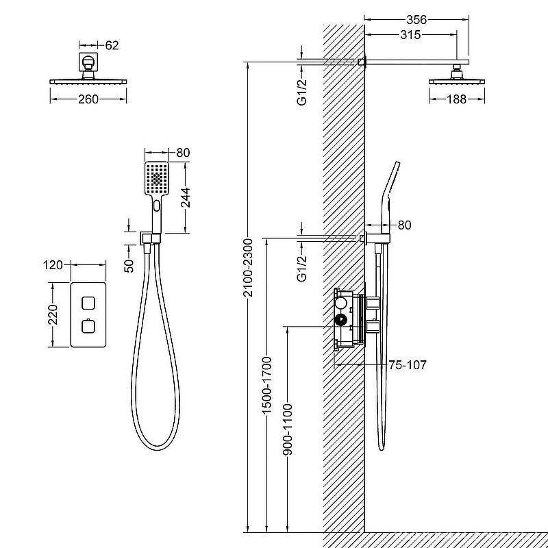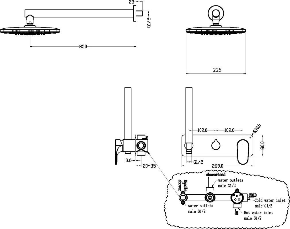 Смеситель встроенный для душа с верхней лейкой SPECTRE matt goldl (верхн. душ 225мм) ZZПод заказ
