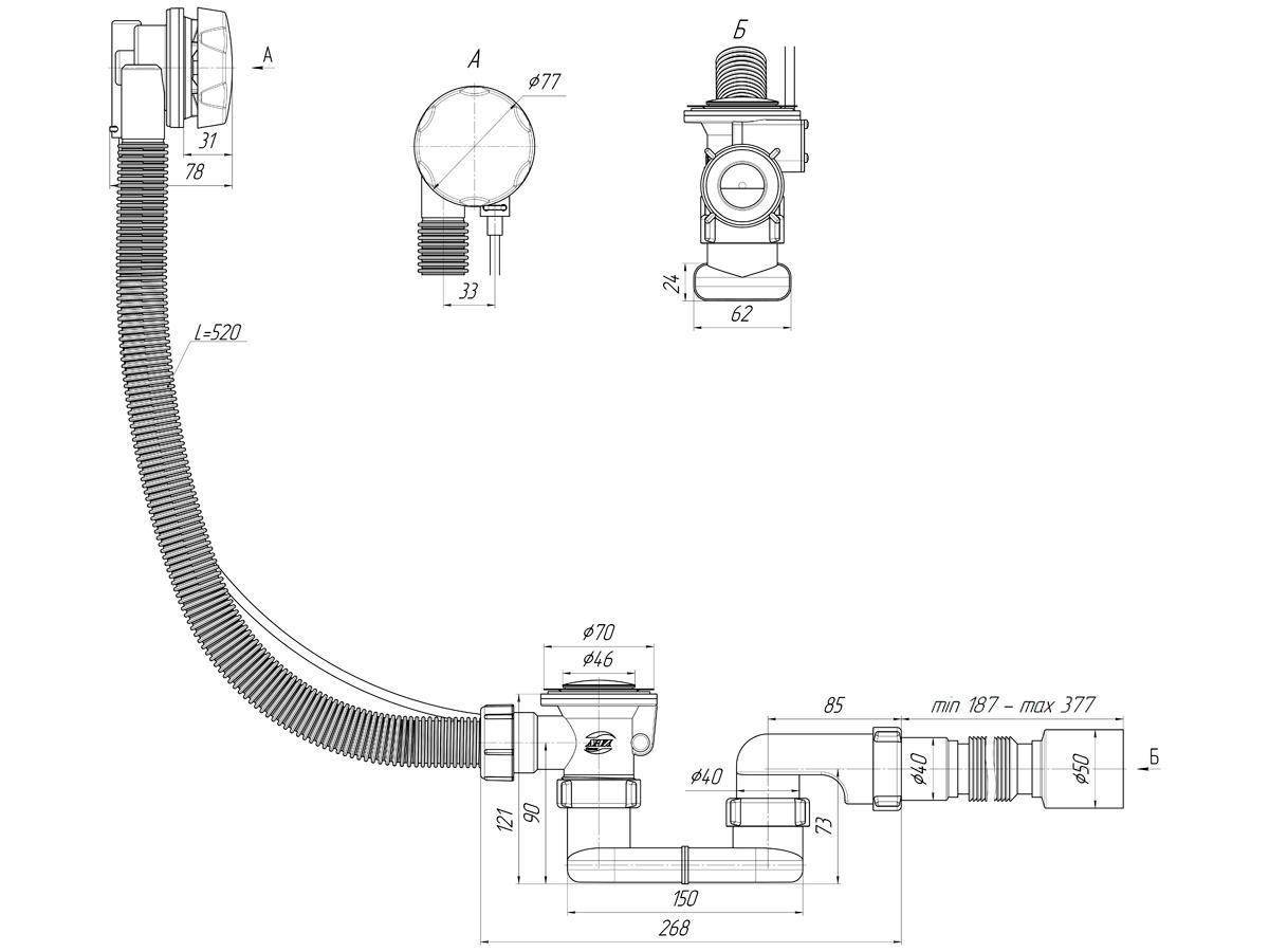 Сифон для ванны click/clack, плоский, с переливом и сеткой, гофра в компл.В наличии